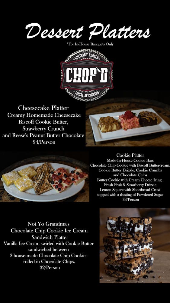 $3 Per Person with a Private Event at Chop'd or Khaos Brewcade & Kitchen. Shortbread Crust Topped With Lemon Curd And Dusting Of Powdered Sugar. Chocolate Chip Cookie Crust With Biscoff Buttercream Cookie Crumbs Chocolate Chips And Cookie Butter Drizzle. Butter Cookie Crust With Cream Cheese Icing, Fresh Fruit Blend (Strawberries, Blueberries And Raspberries) And Strawberry Sauce Drizzle.Made-In-House Ice Cream Sandwiches