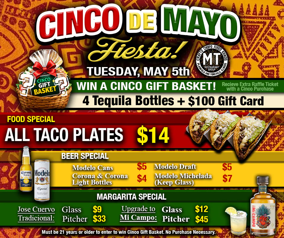 Guests 21+ will be receive a raffle ticket for our Cinco Gift Basket (4 Bottles of Tequila + $100 Gift Card) & extra tickets with any purchase of Cinco Specials!