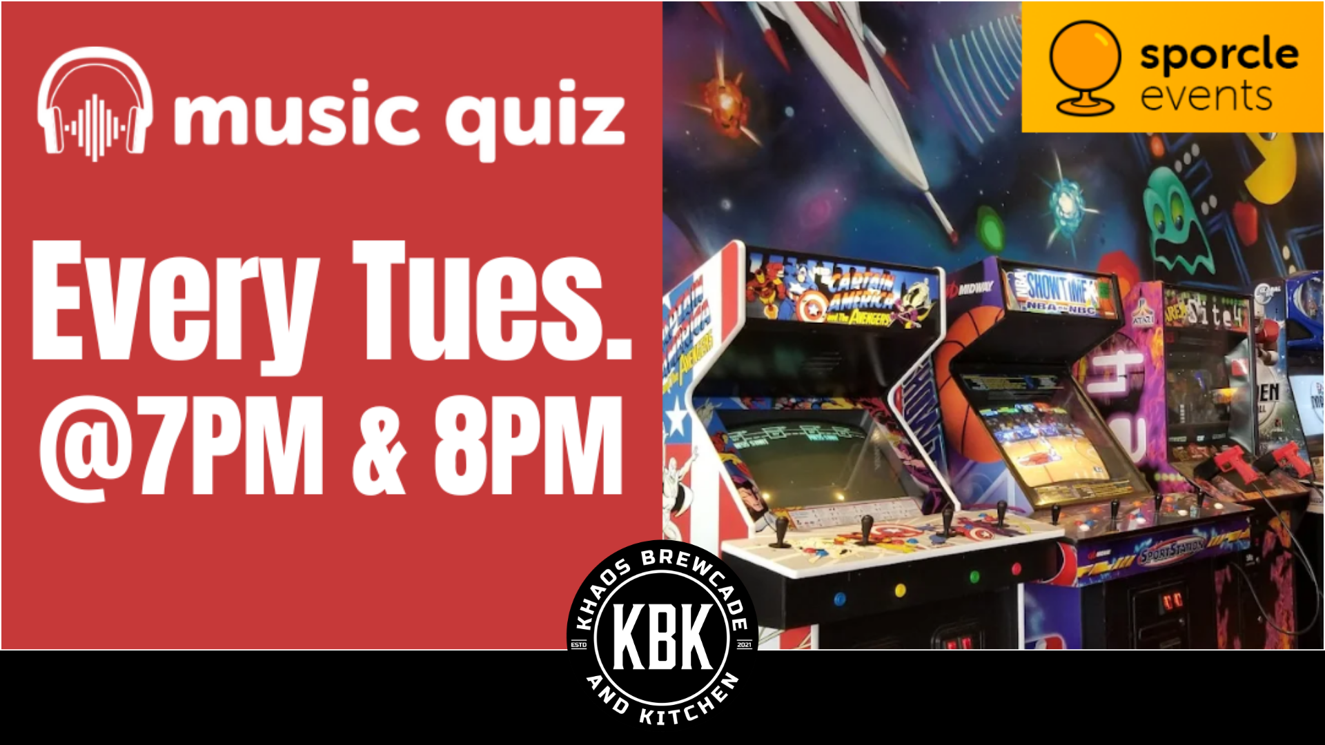Join us at Khaos Brewcade every Tuesday for Music Quiz Night! 7 + 8 PM Games are free to play.