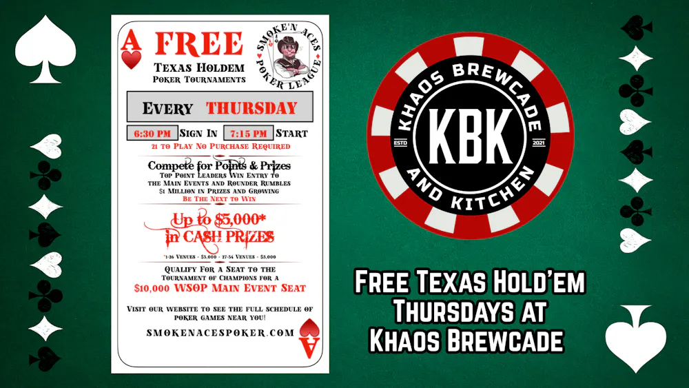 Texas Holdem Poker Thursdays at Khaos Brewcade - Thursday 4/16 at 7:15 PM (6:30 PM Sign In)