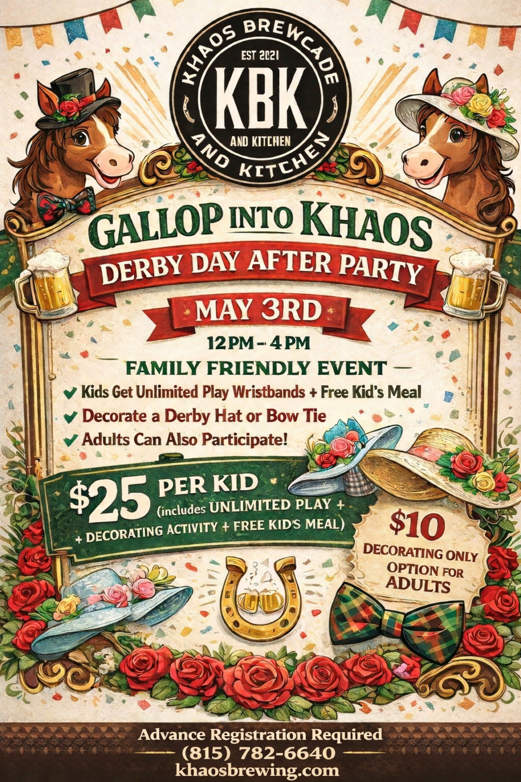 Decorate your own Derby hat or bow tie at Khaos Brewcade on Sunday May 3rd! Parents can also participate in decorating.